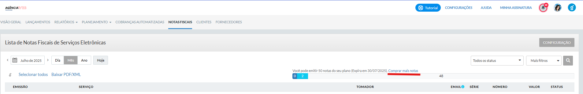 Se você está tentando emitir uma nota fiscal e recebeu o aviso de que atingiu o limite do seu plano, fica tranquilo: dá pra resolver rapidinho. É só comprar um pacote adicional de NFS-e dentro do próprio Granatum.